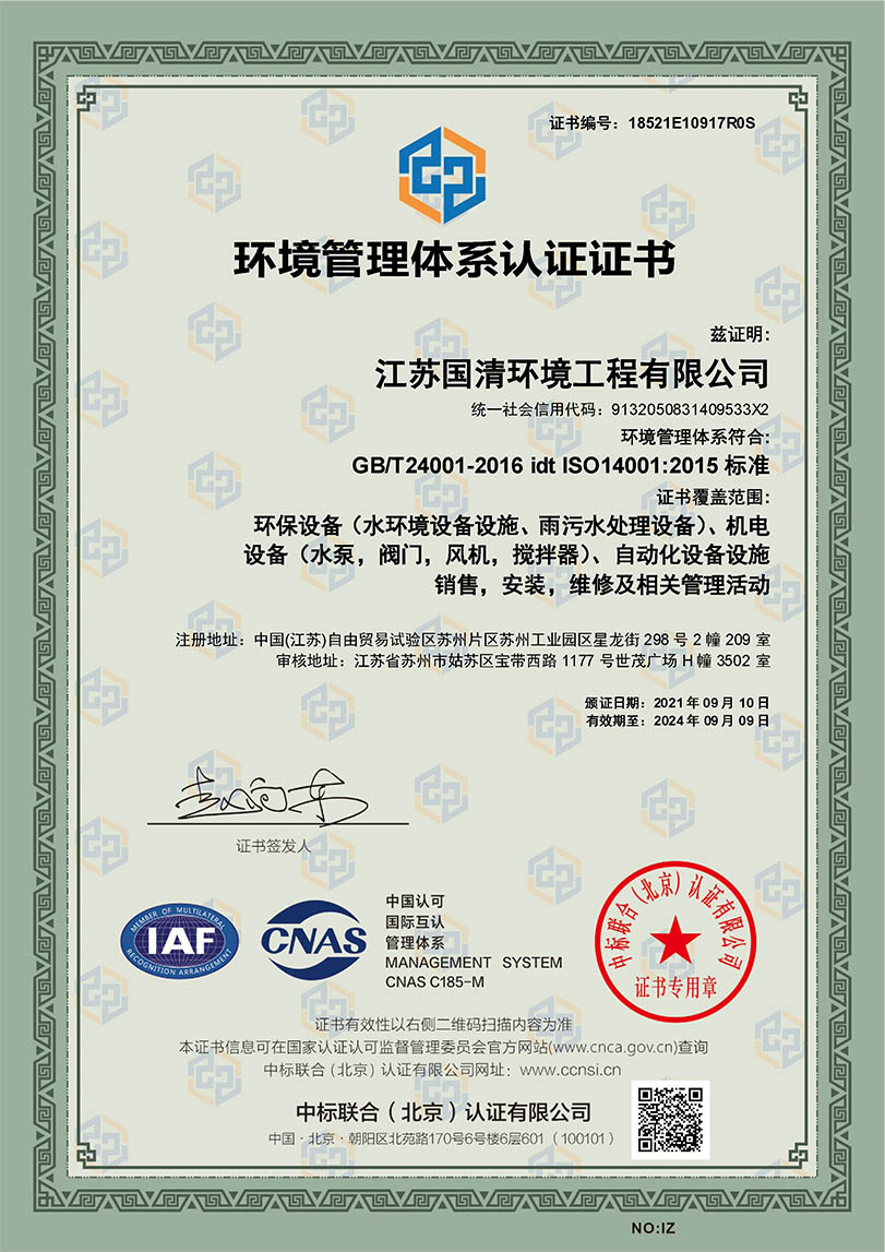 环境管理体系认证证书